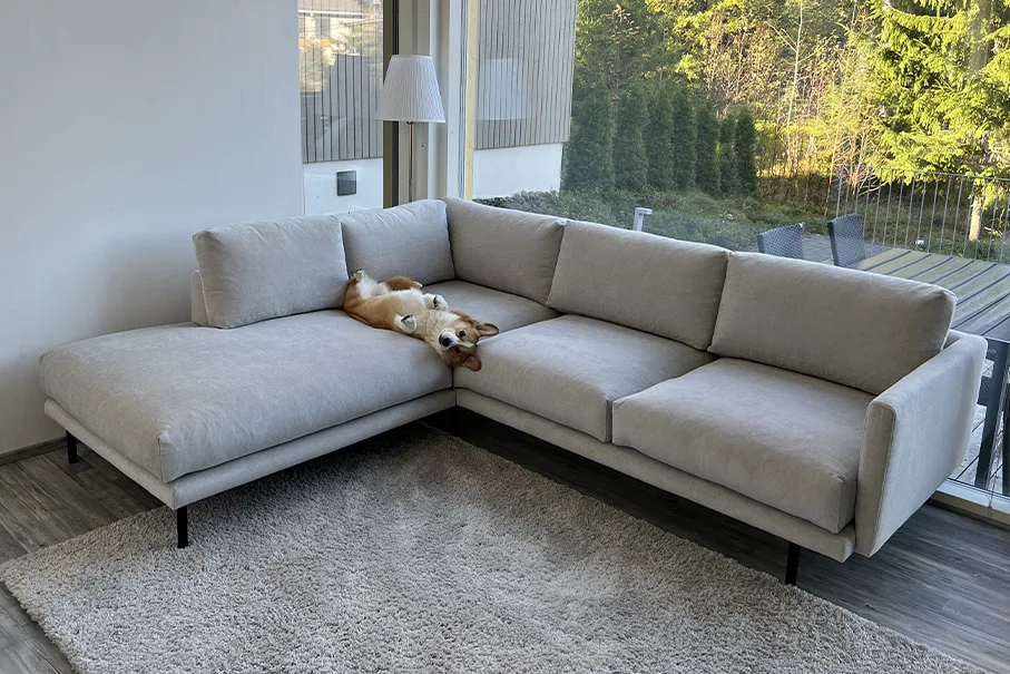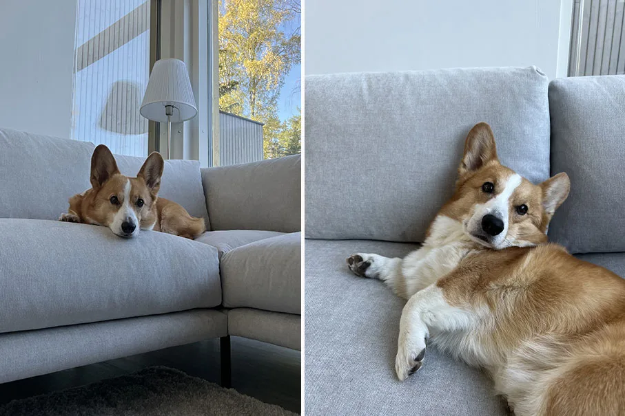 ”Meidän kangasvalinnaksi valikoitui lopulta Velvety-kangas sen kestävyyden ja helpon puhdistettavuuden vuoksi. Sohvan sävy on todella kaunis ja myös siitä täydellinen, etteivät Topin karvat erotu siitä laisinkaan. Pidimme myös erityisesti sen samettimaisesta pinnasta. Pääsimmekin jo testaamaan kankaan puhdistettavuutta, kun sohvaan jäi pieni jälki Topin tassuista. Pyyhkäisimme kohdan märällä liinalla ja jälki on poissa!”