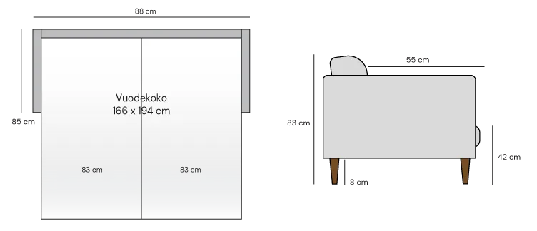 Puuseppämme ovat valmistaneet tämän kotimaisen sohvan rungon massiivipuusta ja koivuvanerista Keravalla – omalla sohvatehtaallamme. Kun runko on valmis, siihen kiinnitetään jouset, vanupehmusteet sekä Finsoffat-huopa. Vuodesohvassa on laadukas suomalainen jousitettu tuplamekanismi. Helppokäyttöinen mekanismi mahdollistaa vuoteen avaamisen yhdelle tai kahdelle nukkujalle. Vuoteiden yhteiskoko on 166×194 cm ja yhden vuoteen 83×194 cm. Vuodesohvan jousitukseen olemme valinneet kestävän NoSag-jousen ja vuodeosuus on tehty kokonaan metallirunkoon. Näin ollen on nukkuessa paras mahdollinen tuki.
