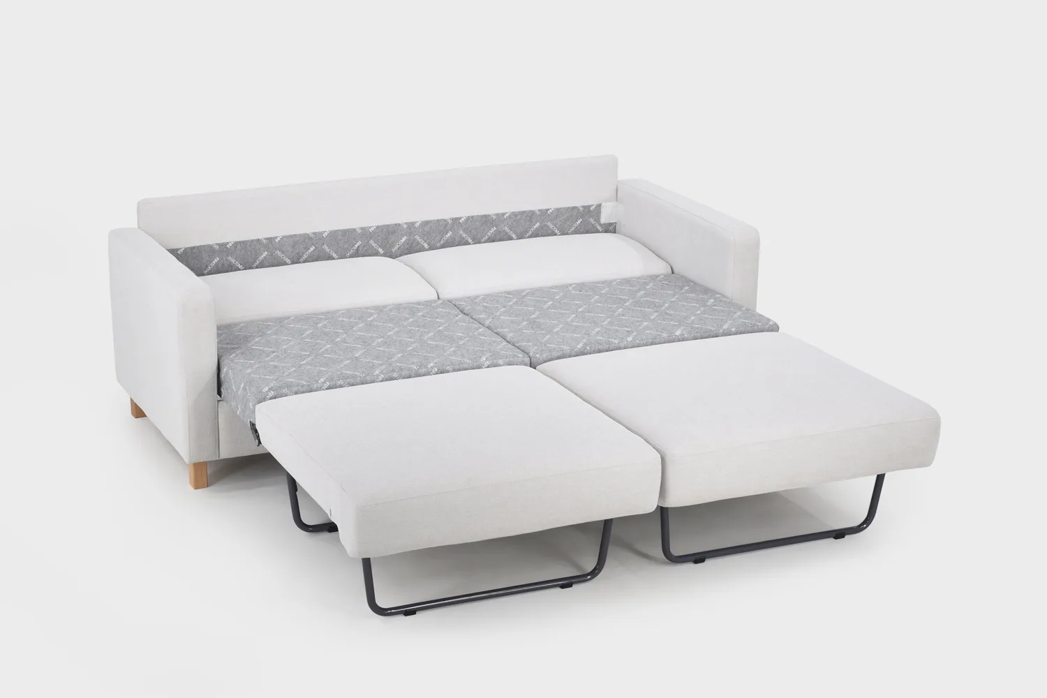 Puuseppämme ovat valmistaneet Aina-vuodesohvan rungon massiivipuusta ja koivuvanerista Keravalla – omalla sohvatehtaallamme. Vuodesohvassa on laadukas suomalainen jousitettu tuplamekanismi, mikä mahdollistaa vuoteen avaamisen joko yhdelle tai kahdelle nukkujalle. Vuodesohvan jousitukseen olemme valinneet kestävän NoSag-jousen ja vuodeosuus on tehty kokonaan metallirunkoon. Näin ollen on nukkuessa paras mahdollinen tuki.