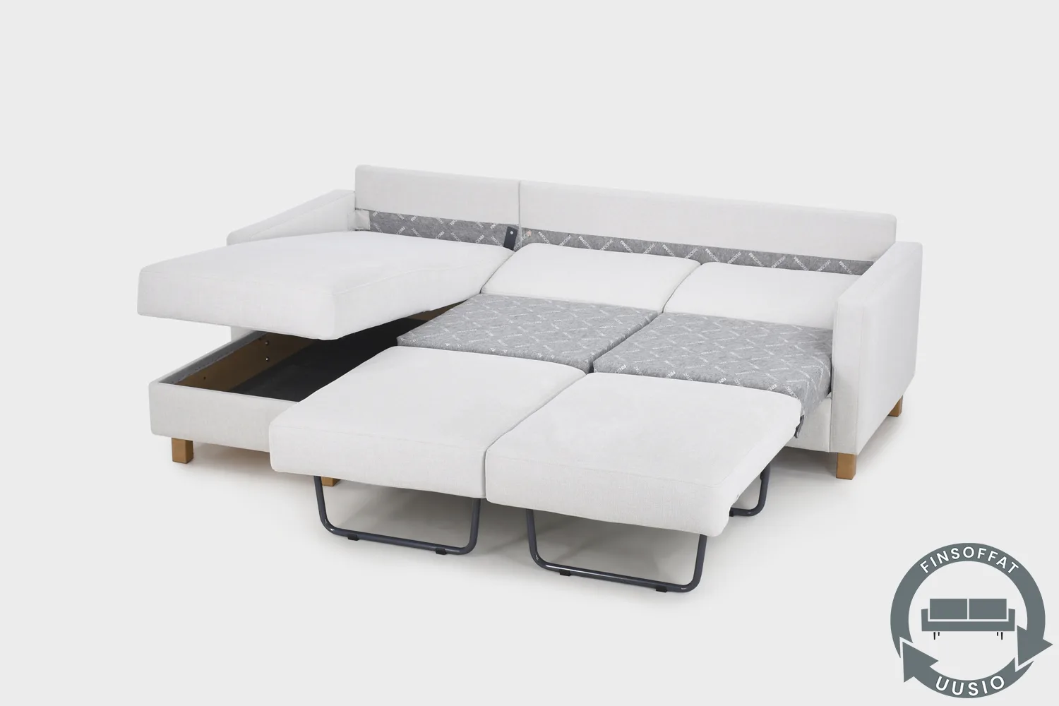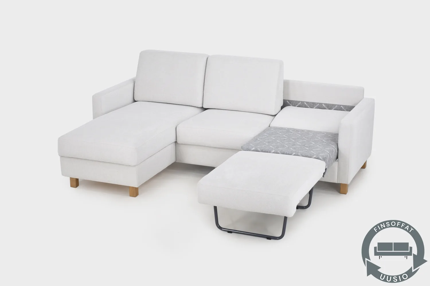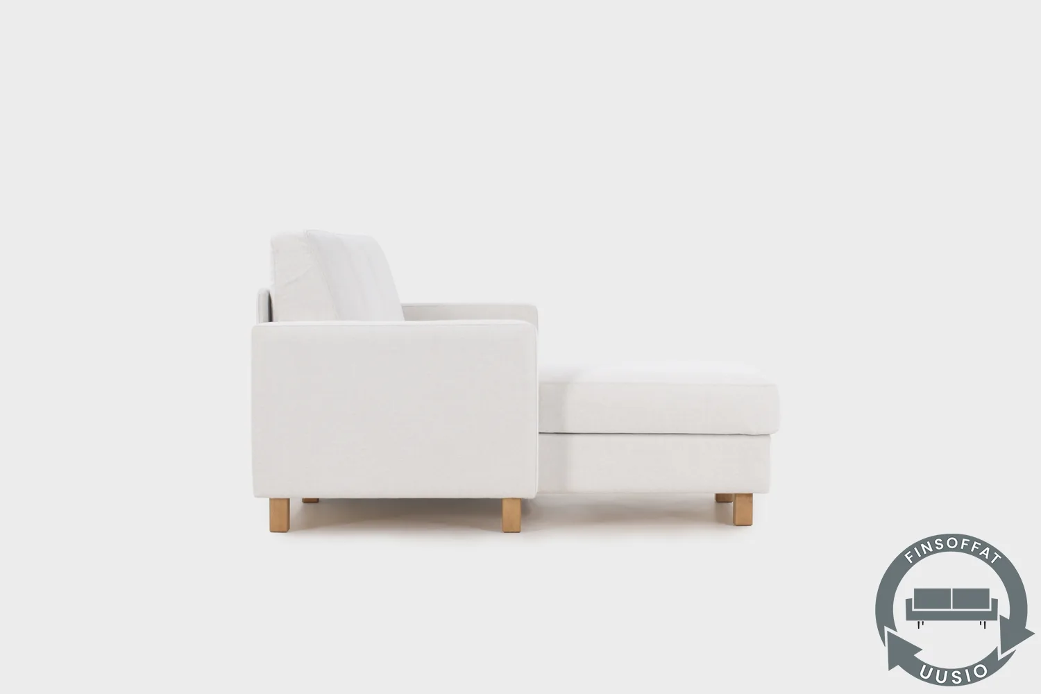 UUSIO-sohvat ovat Finsoffien valmistamia kotimaisia sohvia, jotka ovat palautuneet meille kierrätyspalvelumme kautta uuden sohvan ostamisen yhteydessä. Kierrätyssohvat käyvät läpi perusteellisen tehdashuollon, jossa niille tehdään kuntotarkastus, joka määrittelee sohvalle tehtävät uudistamistoimenpiteet. Kaikki sohvat tuuletetaan ja puhdistetaan sekä tarkastetaan huolella vaurioiden osalta. Sohvan runko, kiinnitykset, mekanismit, täytteet ja verhoilu käydään läpi ja tarvittaessa korjataan ja uusitaan. Tälle Aina-kulmavuodesohvalle on tehty uudelleenverhoilu.