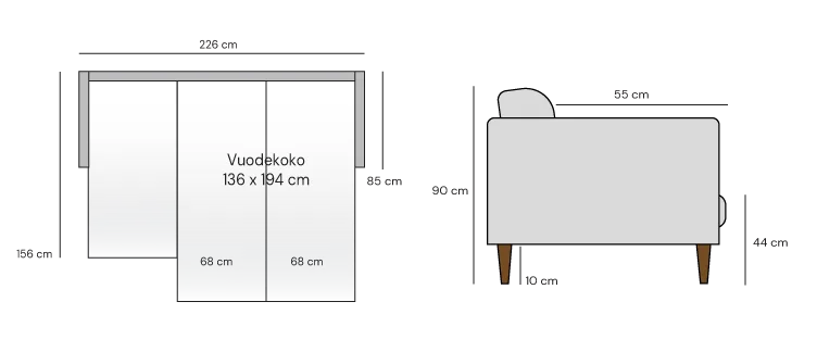 Aina-divaanivuodesohvan kokonaisleveys on 226 cm, syvyys 85 cm ja istumasyvyys 55 cm. Divaanin syvyys on 156 cm. Käsinojan leveys on 11 cm.
