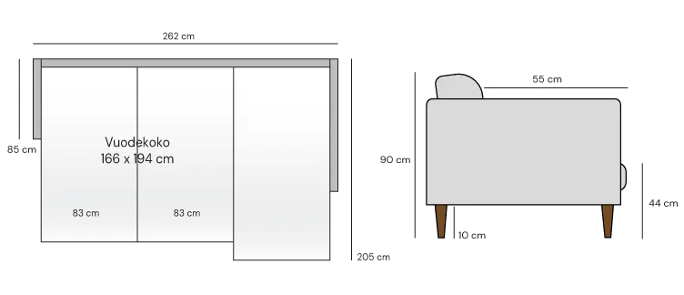 Tämä laadukas vuodesohva on varustettu suomalaisella jousitetulla tuplamekanismilla. Helppokäyttöinen mekanismi ja divaaniosa mahdollistavat vuoteet yhdelle, kahdelle tai jopa kolmelle nukkujalle. Vuoteiden yhteiskoko on 166×194 cm, divaanissa kolmas nukkumapaikka 85×203 cm. Divaaniosan alta löytyy kätevä säilytystila vuodevaatteille!