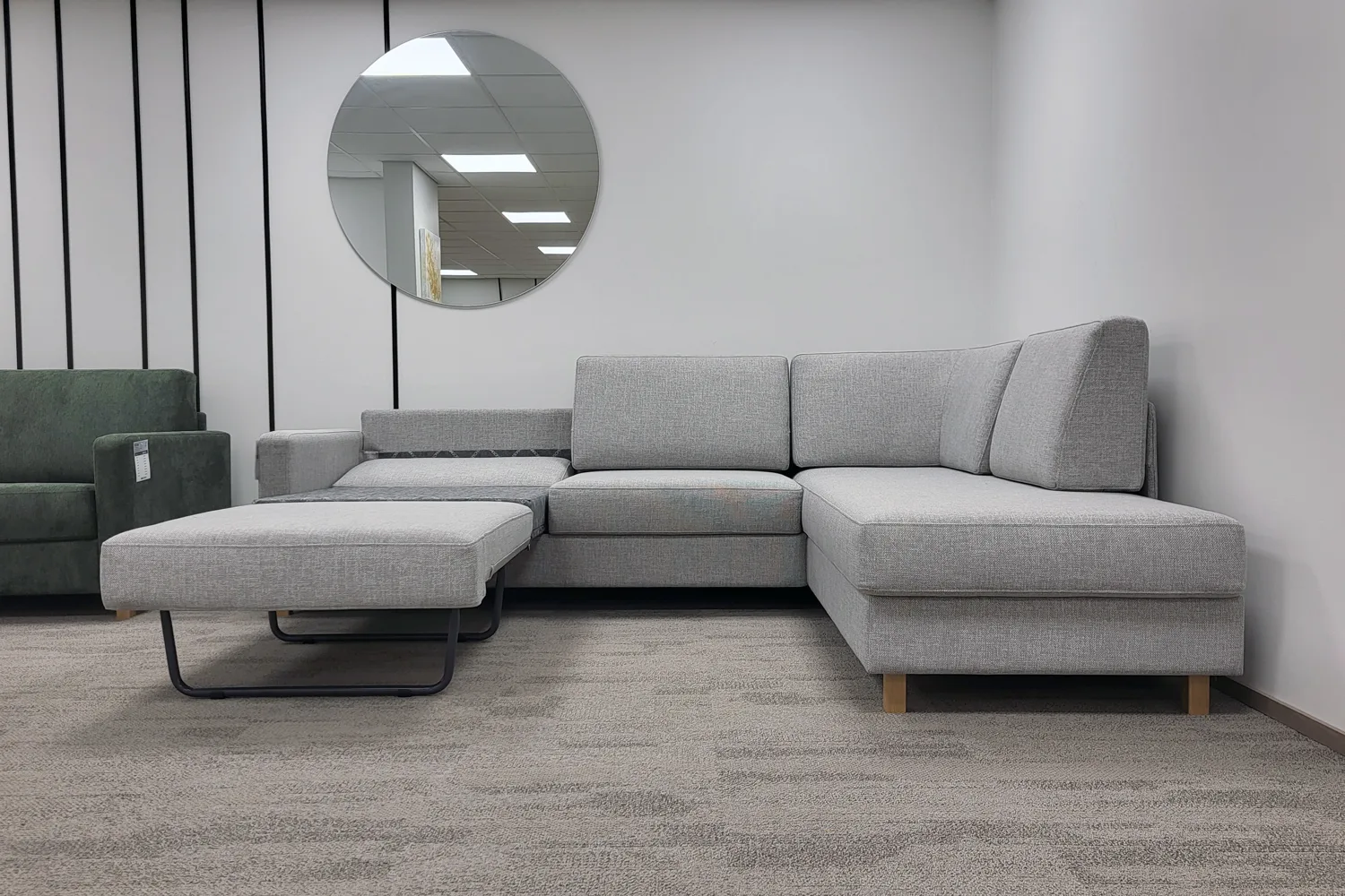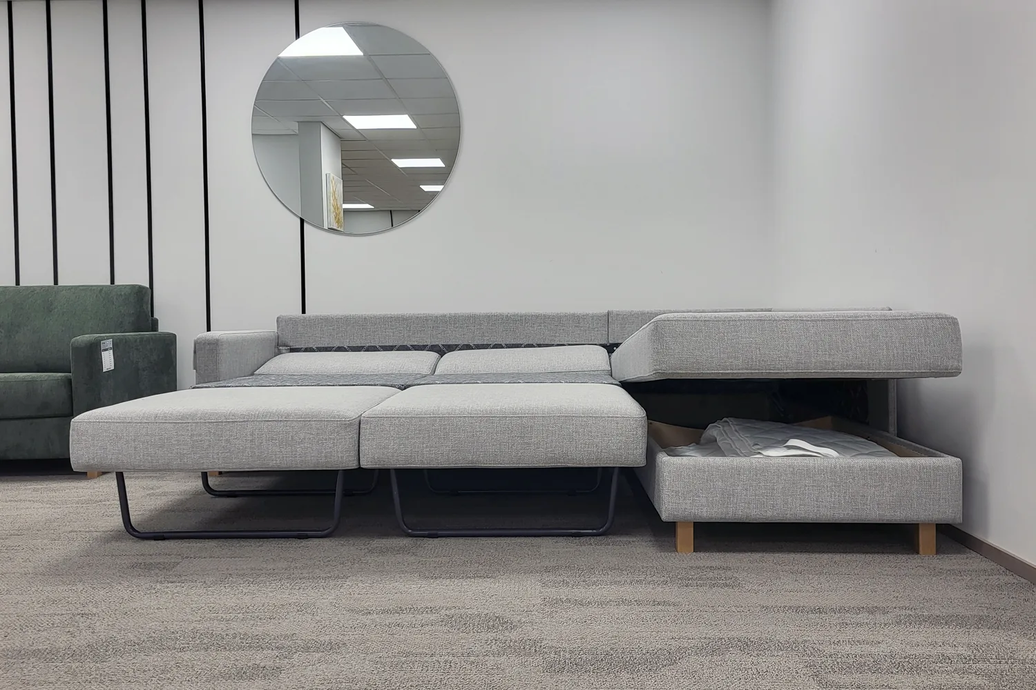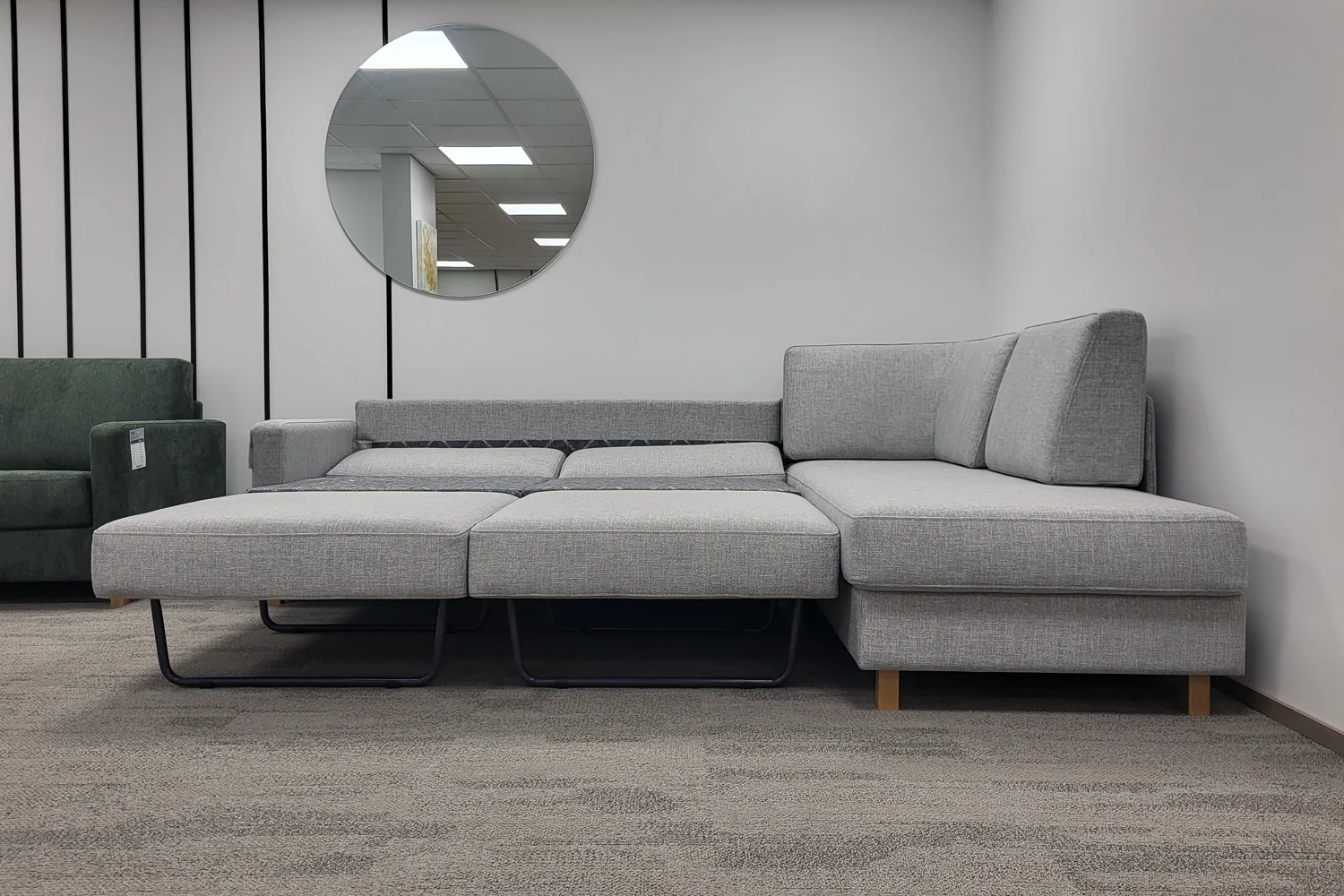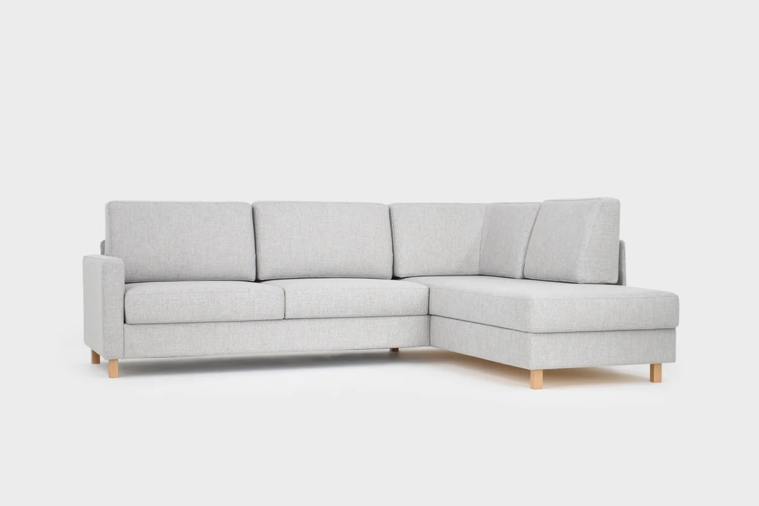 Puuseppämme ovat valmistaneet Aina-kulmavuodesohvan rungon massiivipuusta ja koivuvanerista Keravalla – omalla sohvatehtaallamme. Vuodesohvassa on laadukas suomalainen jousitettu tuplamekanismi. Helppokäyttöinen mekanismi ja divaaniosa mahdollistavat vuoteet yhdelle, kahdelle tai jopa kolmelle nukkujalle. Kahden vuoteen yhteiskoko on 166×194 cm. Vuodesohvan jousitukseen olemme valinneet kestävän NoSag-jousen ja vuodeosuus on tehty kokonaan metallirunkoon. Näin ollen on nukkuessa paras mahdollinen tuki.