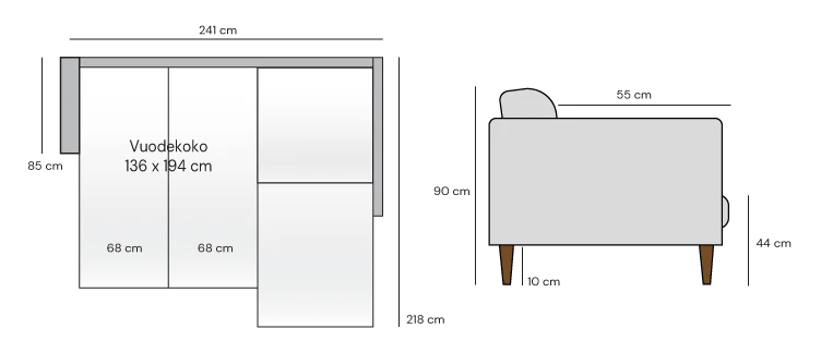Aina-vuodekulmasohvan kokonaisleveys on 241 cm, syvyys 85 cm ja istumasyvyys 55 cm. Divaanin syvyys on 218 cm. Käsinojan leveys on 20 cm.