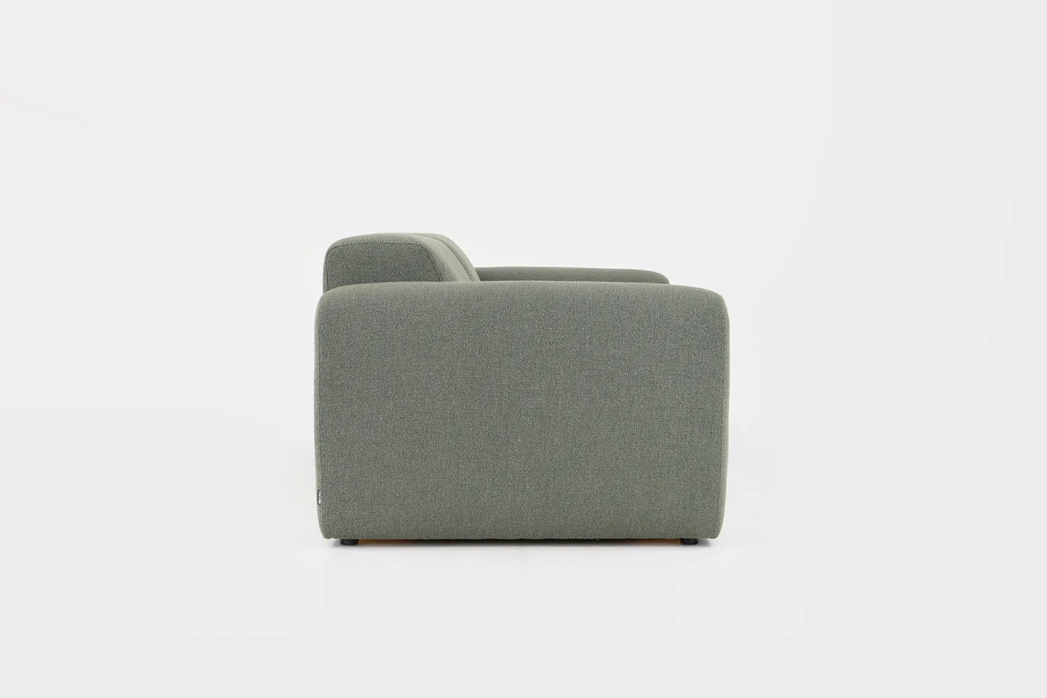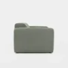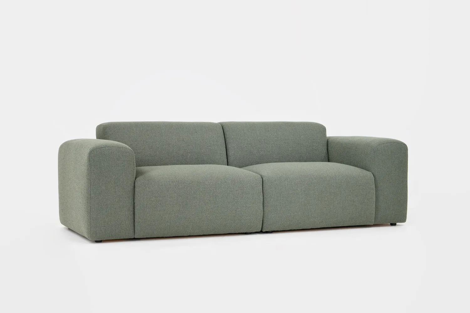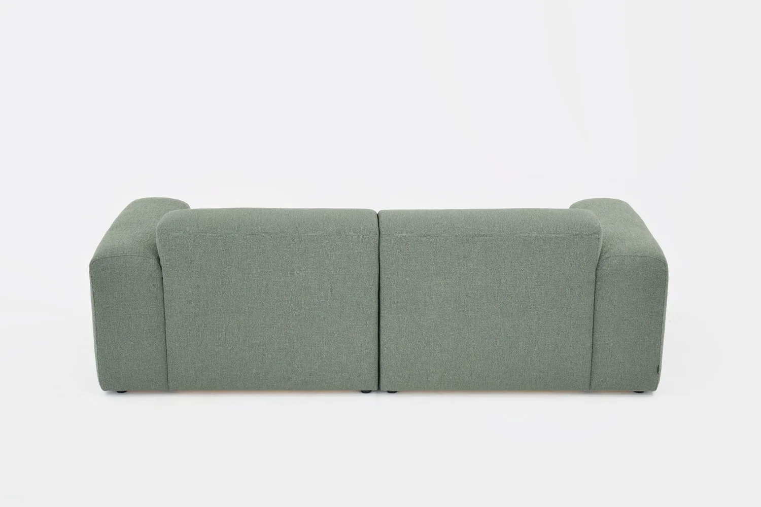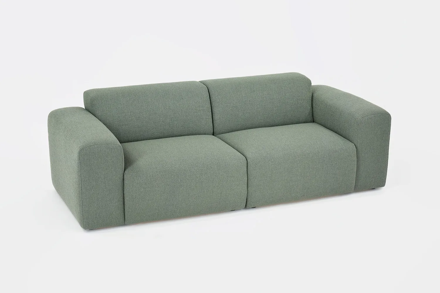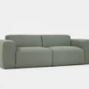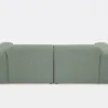 Kolmen istuttava vihreä boho sohva bukleekankaalla eri suunnista ja kahdella valkoisella sisustustyynyllä.