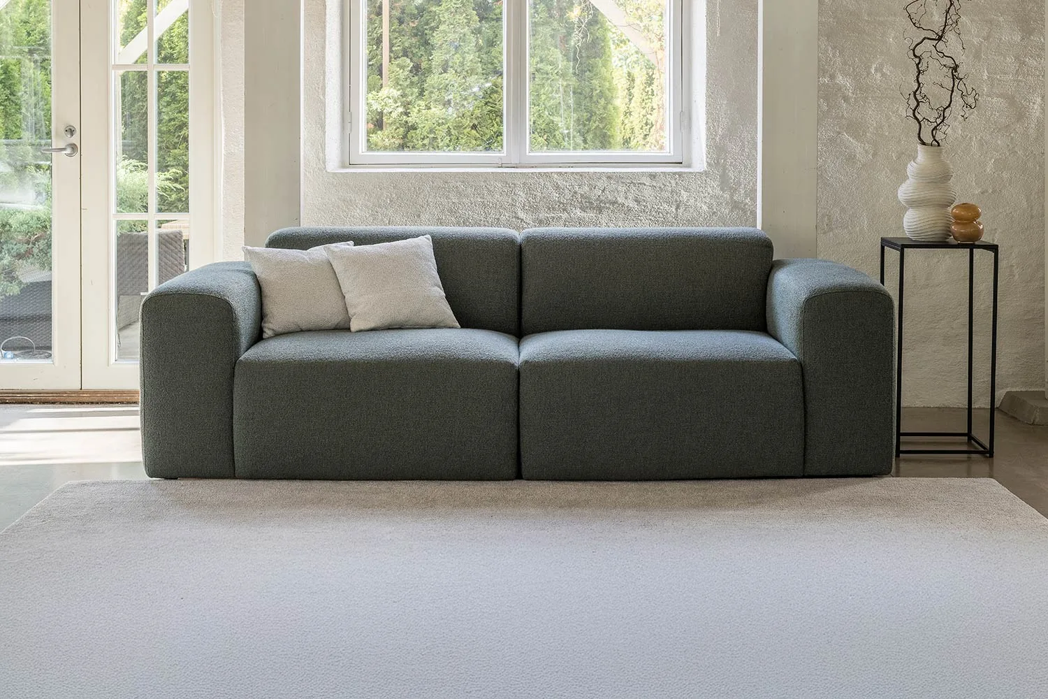 Kolmen istuttava vihreä boho sohva bukleekankaalla ja sohvan edessä valkoinen pyöreä rahi.
