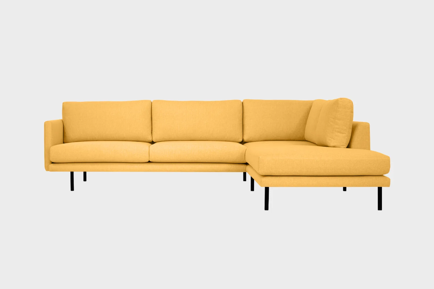 Kanerva-avokulmasohvassa on modernit 3 cm leveät ja 18 cm korkeat pyöreät mustat metallijalat. Korkeat jalat tuovat sisustukseen ilmavuutta ja helpottavat myös sohvan alta siivoamista.