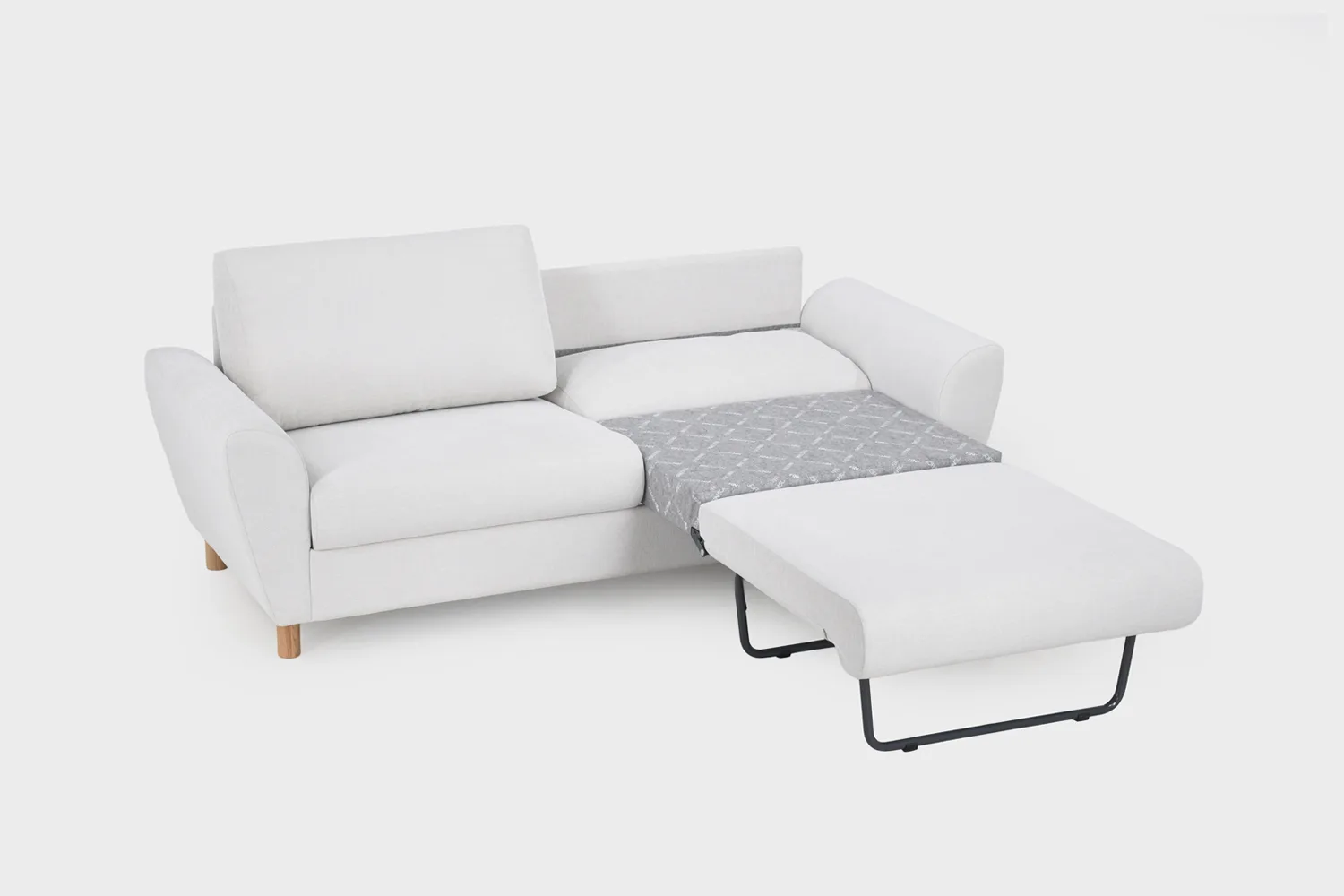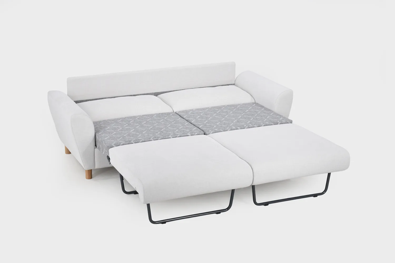 Mallikappaleen runko on valmistettu massiivipuusta ja koivuvanerista Keravalla – omalla sohvatehtaallamme. Vuodesohvassa on laadukas suomalainen jousitettu tuplamekanismi, mikä mahdollistaa vuoteen avaamisen joko yhdelle tai kahdelle nukkujalle. Vuodesohvan jousitukseen olemme valinneet kestävän NoSag-jousen ja vuodeosuus on tehty kokonaan metallirunkoon. Näin ollen on nukkuessa paras mahdollinen tuki. Kotimaisen laadun takeeksi Finsoffat myöntää tälle kotimaiselle vuodesohvalle 20 vuoden runko- ja joustintakuun. Vuodesohvan syvyys on 85 cm istumasyvyyden ollessa 55 cm.