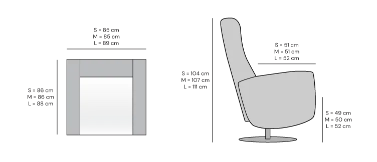 - S-koko: leveys 85 cm, syvyys 86 cm, korkeus 104 cm, istumakorkeus 49 cm ja istumasyvyys 51 cm