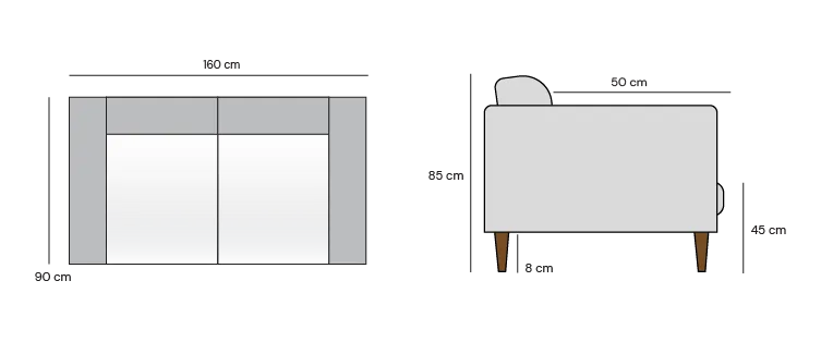 2-istuttava Oliver-sohva on kokonaisleveydeltään 160 cm ja siinä on monelle sopiva syvyys 90 cm istumasyvyyden ollessa 50 cm. Käsinojan leveys on 20 cm.