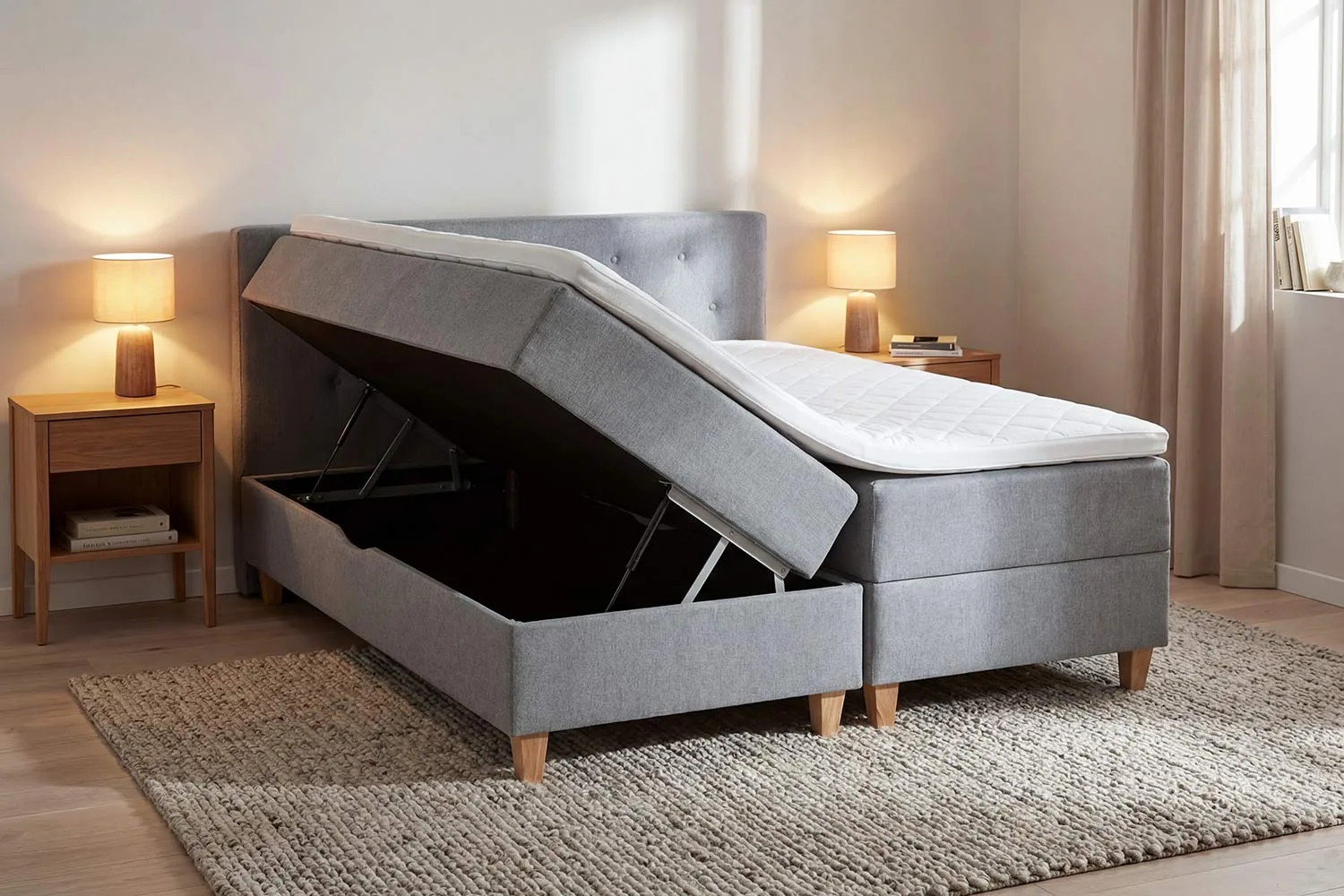 Laatikkosängyn avausmekanismina on laadukas kaasujousi, joka pitää sängyn ylhäällä ja se on helppo avata sekä sulkea.