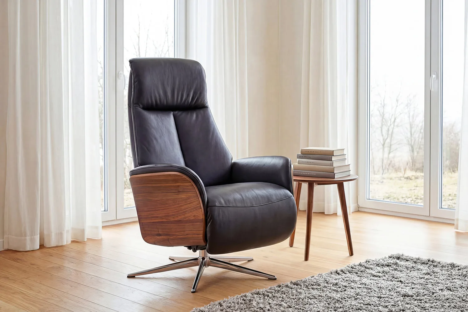 Slimline 4.0 8183 nahkainen lepotuoli mekanismilla yhdistää ajattoman muotoilun ja ensiluokkaisen käyttömukavuuden. Nahkaverhoiltu pyörivä lepotuoli on tilattavissa omien mieltymysten mukaisesti – voit valita verhoilun ja jalan värin sekä käsinojan puusivujen sävyn. Selkänojan, jalkatuen ja niskatyynyn asentoa voidaan säätää erikseen, mikä tekee mekanismituolista ihanteellisen oleskelutuolin.