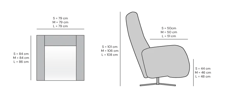 - S-koko: leveys 79 cm, syvyys 84 cm, korkeus 101 cm, istumakorkeus 44 cm ja istumasyvyys 50 cm